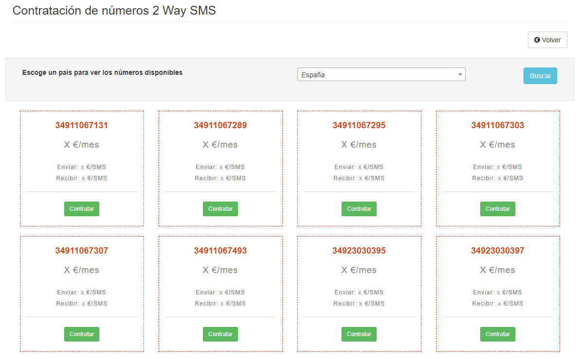 Una vez que estés en la página de contratación de números 2 Way SMS, debes escoger el país del número que quieres contratar, y te aparecerán los números 2 Way SMS disponibles para contratar de ese país. Los números a contratar pueden ser fijos o móviles según disponibilidad.