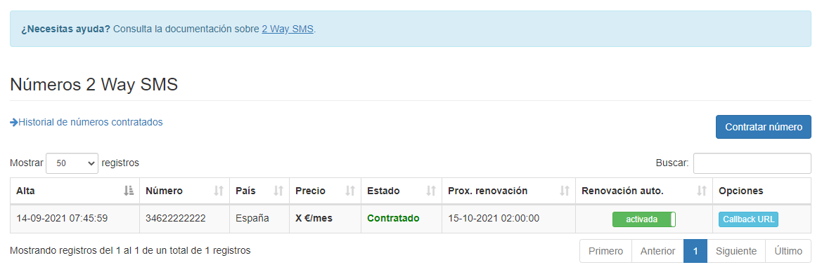 Para contratar un número 2 Way SMS, dirígete al listado de números 2 Way SMS y pulsa el botón de Contratar número.