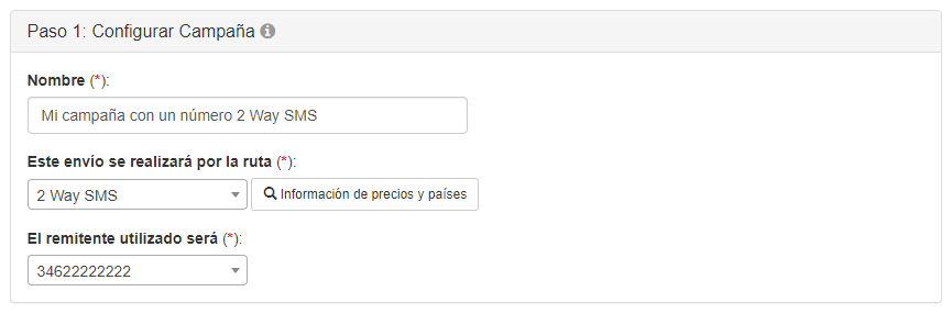 Cuando selecciones la ruta de envío de números 2 Way SMS, deberás escoger como remitente el número por el que quieres enviar el SMS.