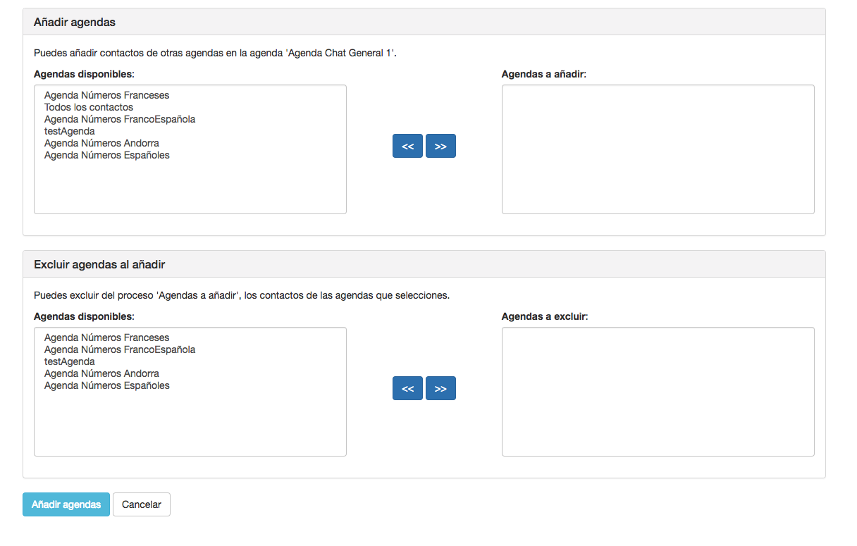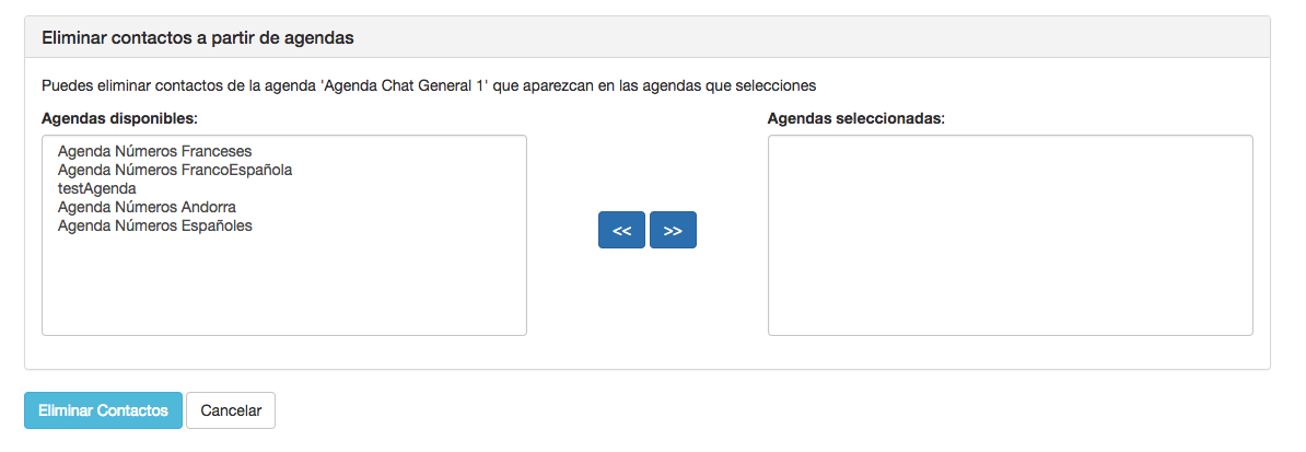 La opción Eliminar contactos a partir de agendas consiste en eliminar de la agenda seleccionada los contactos que estén presentes en las agendas que selecciones.