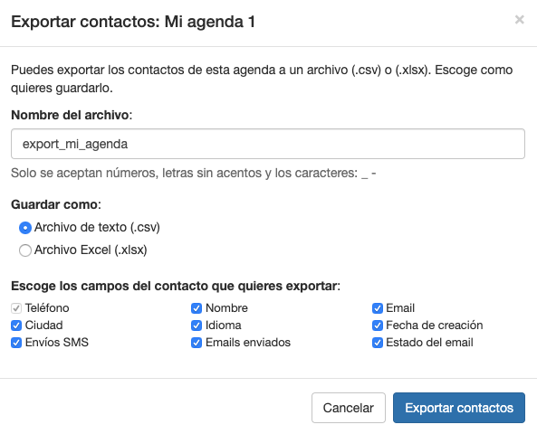 Puedes exportar los contactos de una agenda a un archivo .csv o .xlsx.