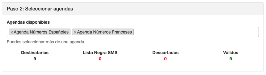 Seleccionar agendas para envío masivo SMS - Telemail Comunicatemas En este ejemplo, hemos escogido una ruta de envío que permite envíos a Francia. La agenda números españoles contiene 6 contactos y la agenda números franceses 3. El total de contactos únicos sumando todas las agendas es 9 (Destinatarios) y los contactos válidos para este envío son 9, es decir, todos los contactos de las agendas.