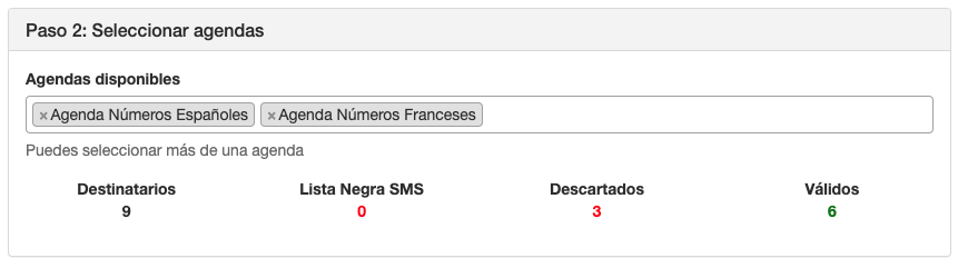 Seleccionar agendas para envío masivo SMS sin ruta de envío - Telemail Comunicatemas En este ejemplo, hemos escogido una ruta que no permite envíos a Francia. La agenda números españoles contiene 6 contactos y la agenda números franceses 3. El total de contactos únicos sumando todas las agendas es 9 (Destinatarios) y los contactos válidos para este envío son 6, todos excepto los 3 franceses que están descartados para el envío.