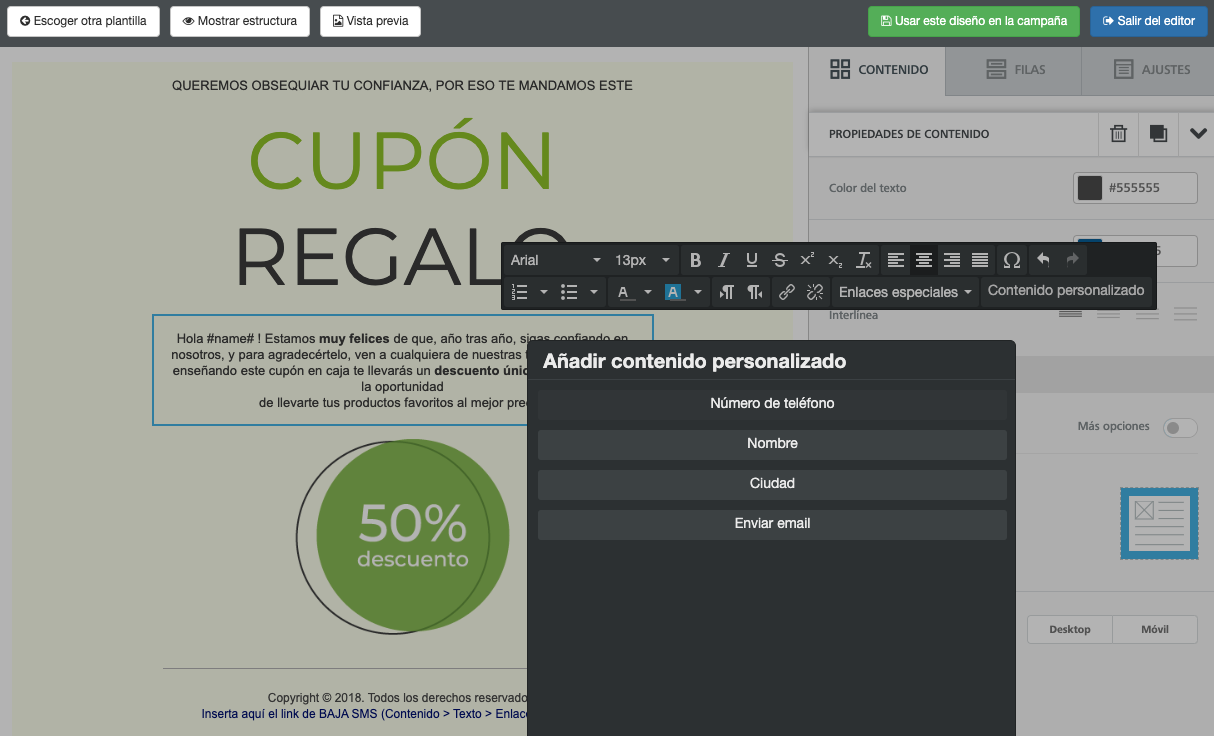 Creamos una nueva agenda y usamos la opción de Importar archivo. Una vez importado, crearemos una nueva campaña de email eligiendo la agenda recién creada. Al diseñar el contenido del email, utilizaremos los campos personalizados para añadir el nombre del contacto y el código de descuento al contenido del email.