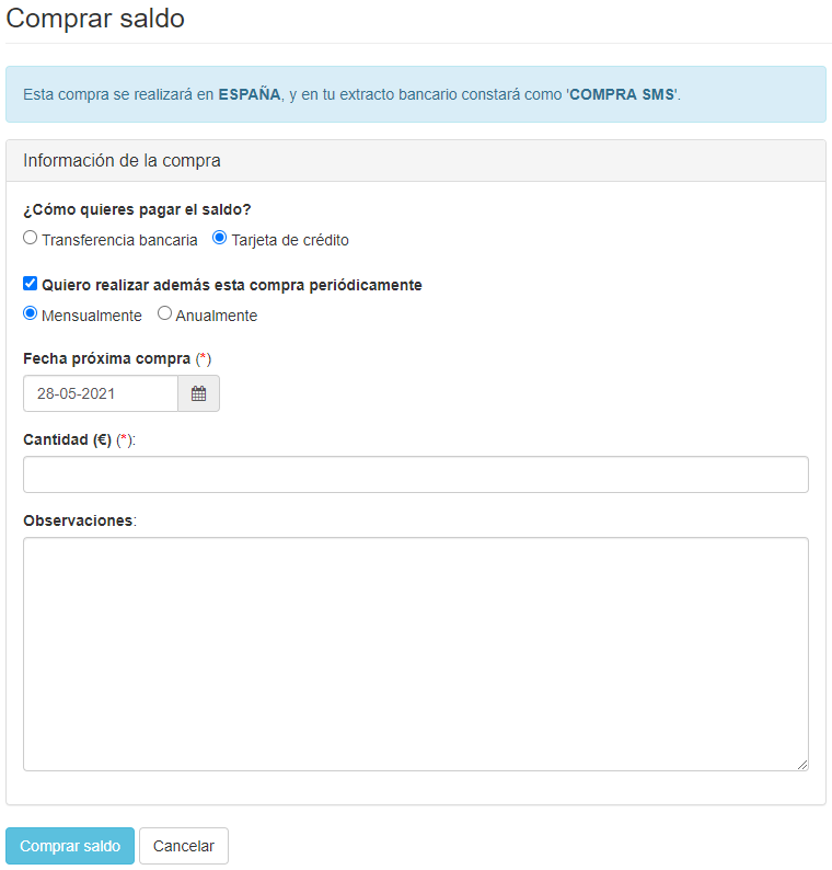 - Fecha próxima compra: Es la fecha en que se realizará la misma compra de saldo con tarjeta de crédito de forma automática. Puedes marcar la fecha que quieras, siempre que sea posterior al día actual, y si no modificas este campo, la fecha tendrá relación con la recurrencia seleccionada.