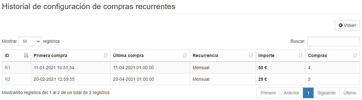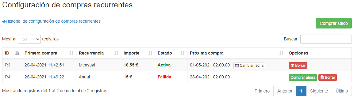 - ID: Referencia de la configuración de compra recurrente, para que puedas pulsar en el enlace y ver las compras de saldo relacionadas.