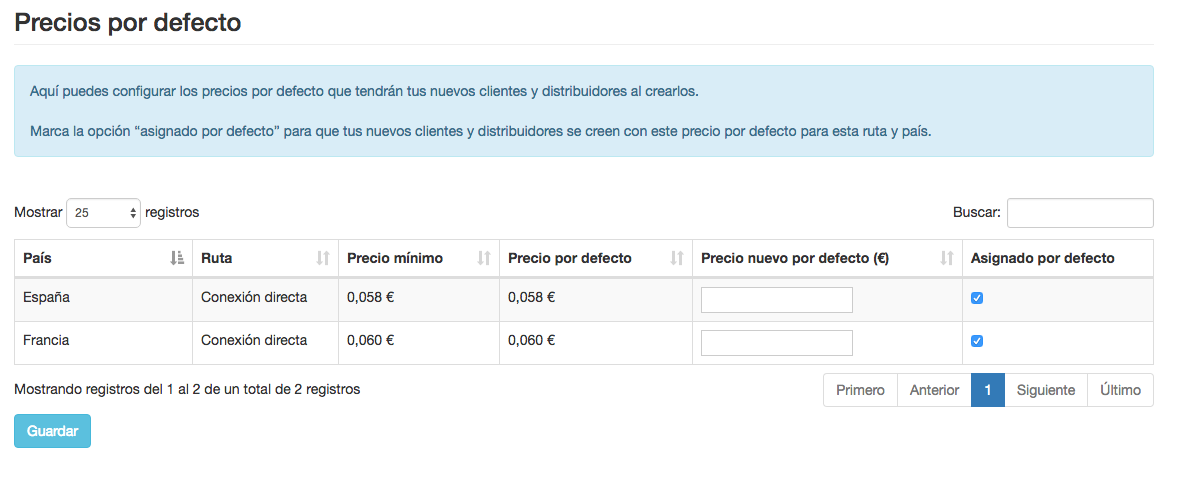 Si marcas la opción de Asignado por defecto, cuando crees un nuevo distribuidor y/o cliente, se le asignará automáticamente la ruta para el país escogido, sin que tengas que ir asignado precios de países uno por uno.