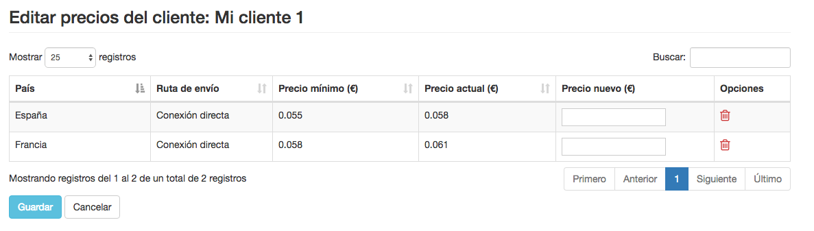 En el campo 'Precio Nuevo (€)' puedes introducir el nuevo precio para el país y la ruta escogida. Si deseas que el cliente y/o distribuidor no pueda enviar más por esta ruta, puedes eliminarla.