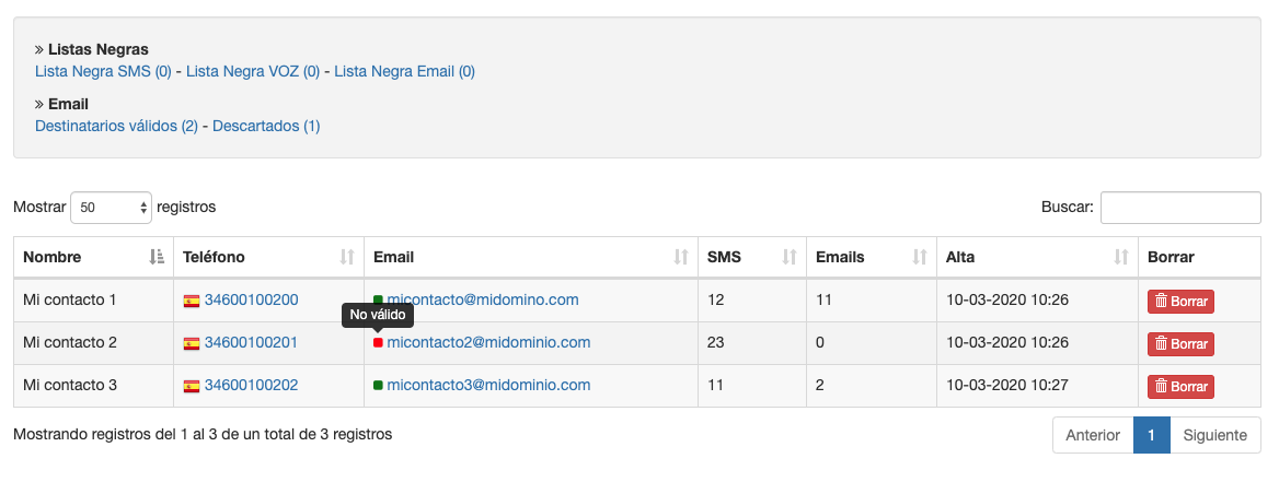 Cada vez que importas un contacto o lo editas, comprobamos el estado de la dirección de email para saber si podrá recibir tus comunicaciones. A diferencia del envío de SMS, enviar comunicaciones a emails inválidos, no existentes o marcados como Rebotado puede provocar que baje la reputación de tu dominio y tus emails sean marcados como SPAM. Para evitar esto, las direcciones de email clasificadas con un estado no válido, serán descartadas automáticamente de tus envíos.