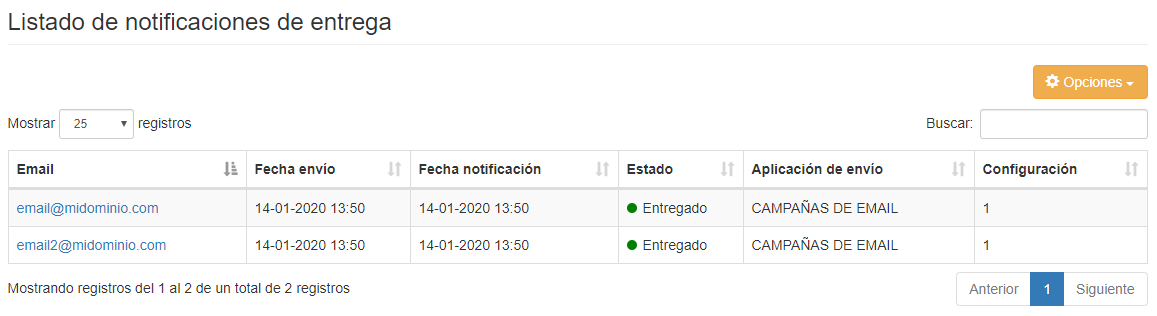 Las notificaciones de entrega son muy útiles para conocer el total de contactos que han recibido tus envíos de emails, ya sea de un envío concreto o de todos tus envíos en general. También puedes obtener que contactos han generado una notificación de entrega de alguno de los errores que hay especificados en la siguiente tabla.