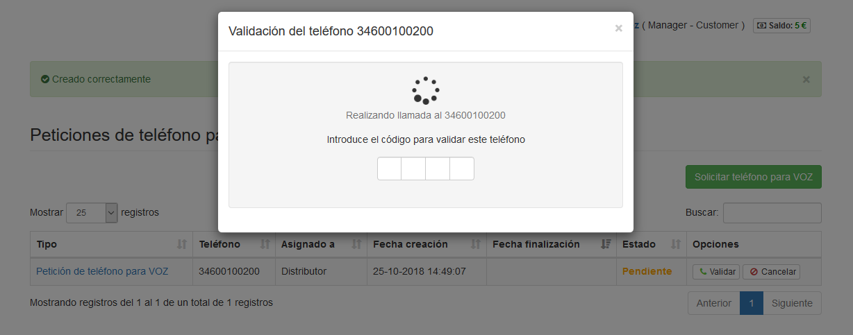 Para poder tener un nuevo remitente para tus envíos de VOZ o bien, tener un número de teléfono validado para poder realizar transferencias de llamadas, debes realizar una petición de teléfono para VOZ y que la petición se valide correctamente.
